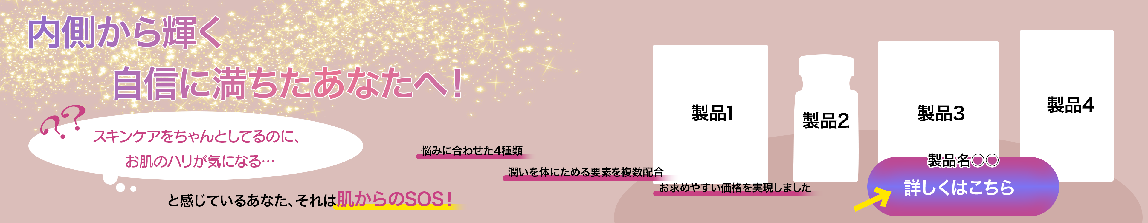・美容系バナーについて…お肌のお悩み、スキンケアに興味がある肩をターゲットに設定しました。美容=ゴージャスというイメージで作成しました。見辛くなら ない程度に少しだけ派手にしました。